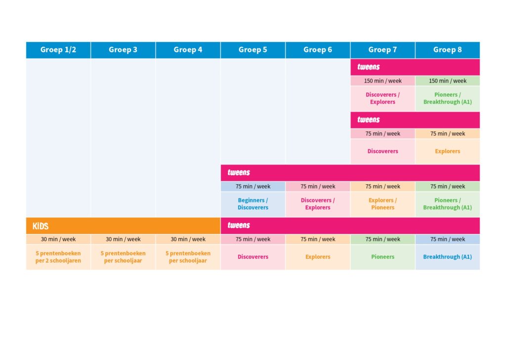 Scholen die goed Engels willen geven en een soepele overgang naar het voortgezet onderwijs willen. Met Tweens leer je online op je een eigen niveau en in de klas ga je samen actief aan de slag in het Engels. Als school bepaal je welke ambitie je hebt en daarmee de tijd die leerlingen online werken en de duur van de klassikale lessen. De beschikking over een aantal devices per groep (50% of meer) is aan te raden.